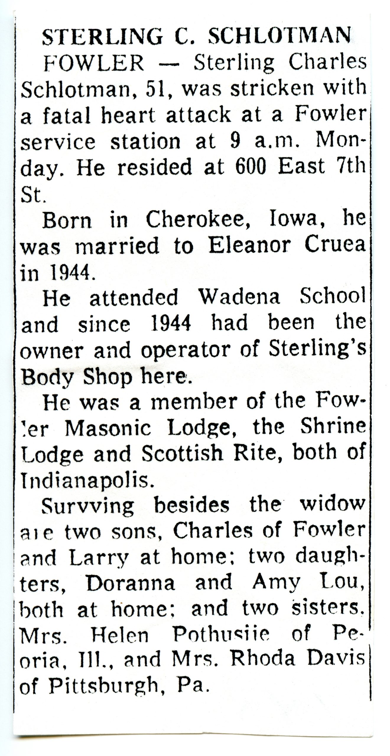 FOWLER Sterling Charles Schlotman, 51, was stricken with a fatal heart attack at a Fowler service station at 9 a.m. Monday. He resided at 600 East 7th St.