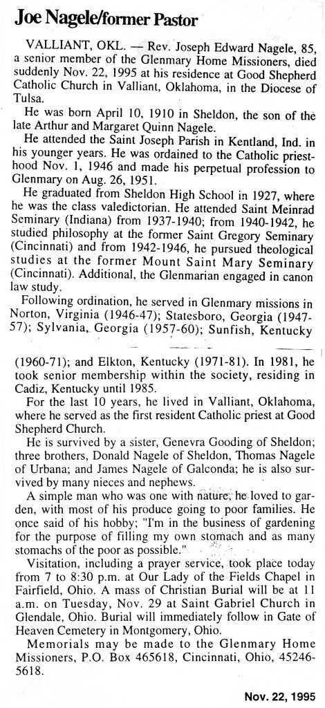 VALLIANT, OKL. – Rev. Joseph Edward Nagele, 85, a senior member of the Glenmary Home Missioners, died suddenly Nov. 22, 1995 at his residence at Good Shepherd Catholic Church in Valliant, Oklahoma, in the Diocese of Tulsa.