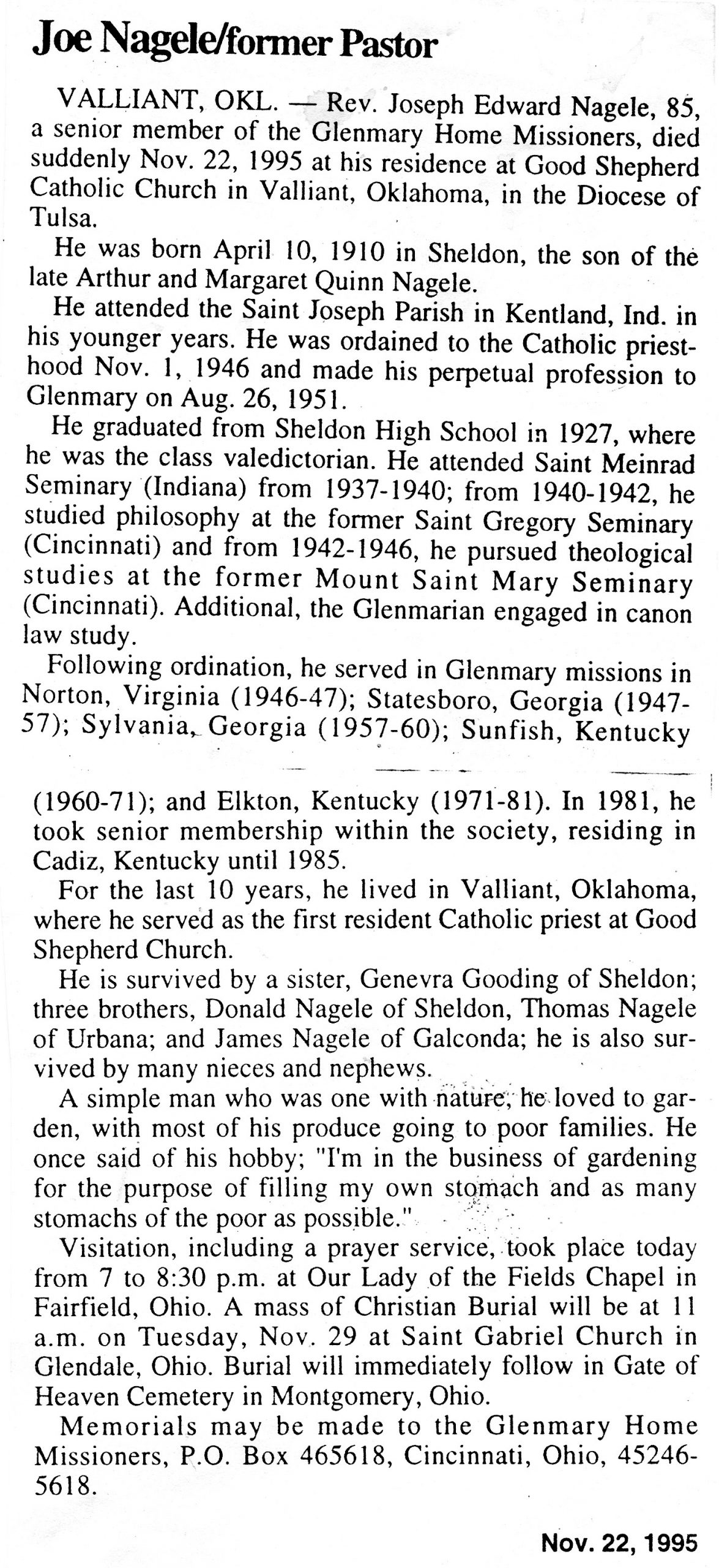 VALLIANT, OKL. – Rev. Joseph Edward Nagele, 85, a senior member of the Glenmary Home Missioners, died suddenly Nov. 22, 1995 at his residence at Good Shepherd Catholic Church in Valliant, Oklahoma, in the Diocese of Tulsa.