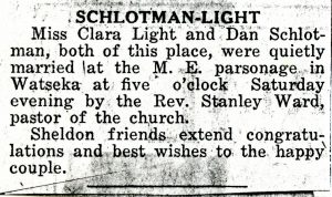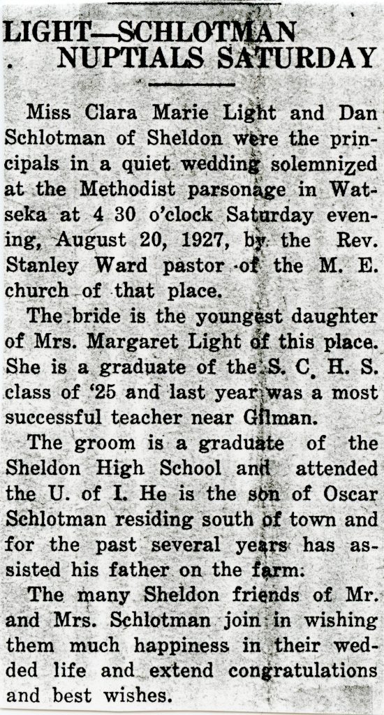 Miss Clara Marie Light and Dan Schlotman of Sheldon were the principals in a quiet wedding solemnized at the Methodist parsonage in Watseka at 4 30 o’clock Saturday evening, August 20, 1927, by the Rev. Stanley Ward pastor of the M. E. church of that place.
