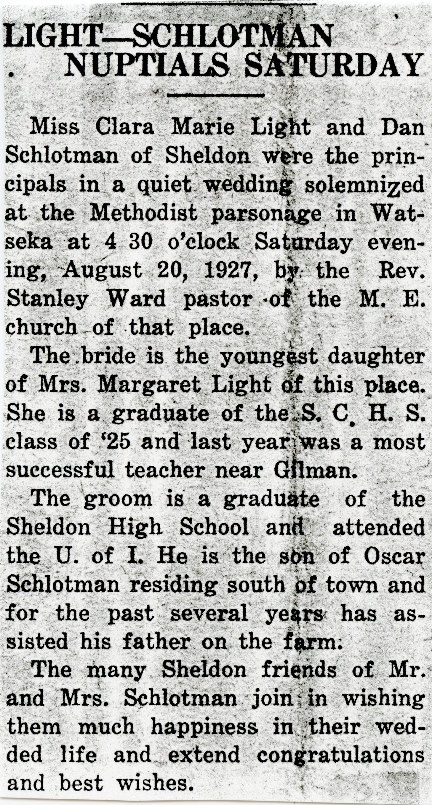 Miss Clara Marie Light and Dan Schlotman of Sheldon were the principals in a quiet wedding solemnized at the Methodist parsonage in Watseka at 4 30 o’clock Saturday evening, August 20, 1927, by the Rev. Stanley Ward pastor of the M. E. church of that place.