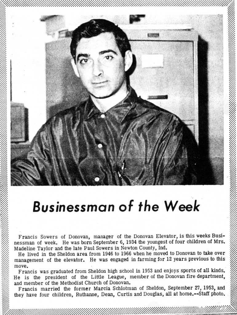 Francis Sowers of Donovan, manager of the Donovan Elevator, is the weeks Businessman of the week. He was born September 6, 1934 the youngest of four children of Mrs. Madeline Taylor and the late Paul Sowers in Newton County, Ind.