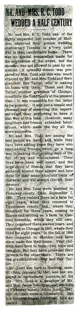 Mr. and Mrs. Todd were married in Pickaway county, Ohio, September 7, 1865. They resided there on a farm for eight years, when they removed to Tippecanoe county, Ind., where they remained for three years, coming to Illinois and settling on a farm in Concord township, which they still own. They remained there eleven years and removed to Chicago in 1887, where they lived for eight years. In the fall of 1895 they removed to Sheldon and have since made this their home. Four children were born to them – two boys and two girls, but they have preceded their parents to the other shore. There are two grandchildren – Roy and Ray Taylor.