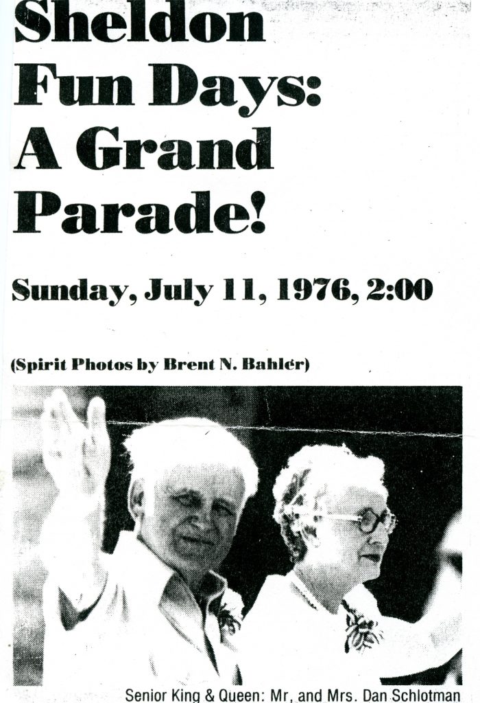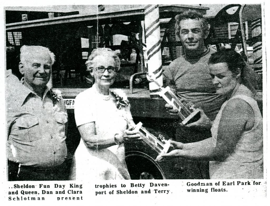 Sheldon Fun Day King and Queen, Dan and Clara Schlotman present trophies to Betty Davenport of Sheldon and Terry Goodman of Early Park for winning floats.