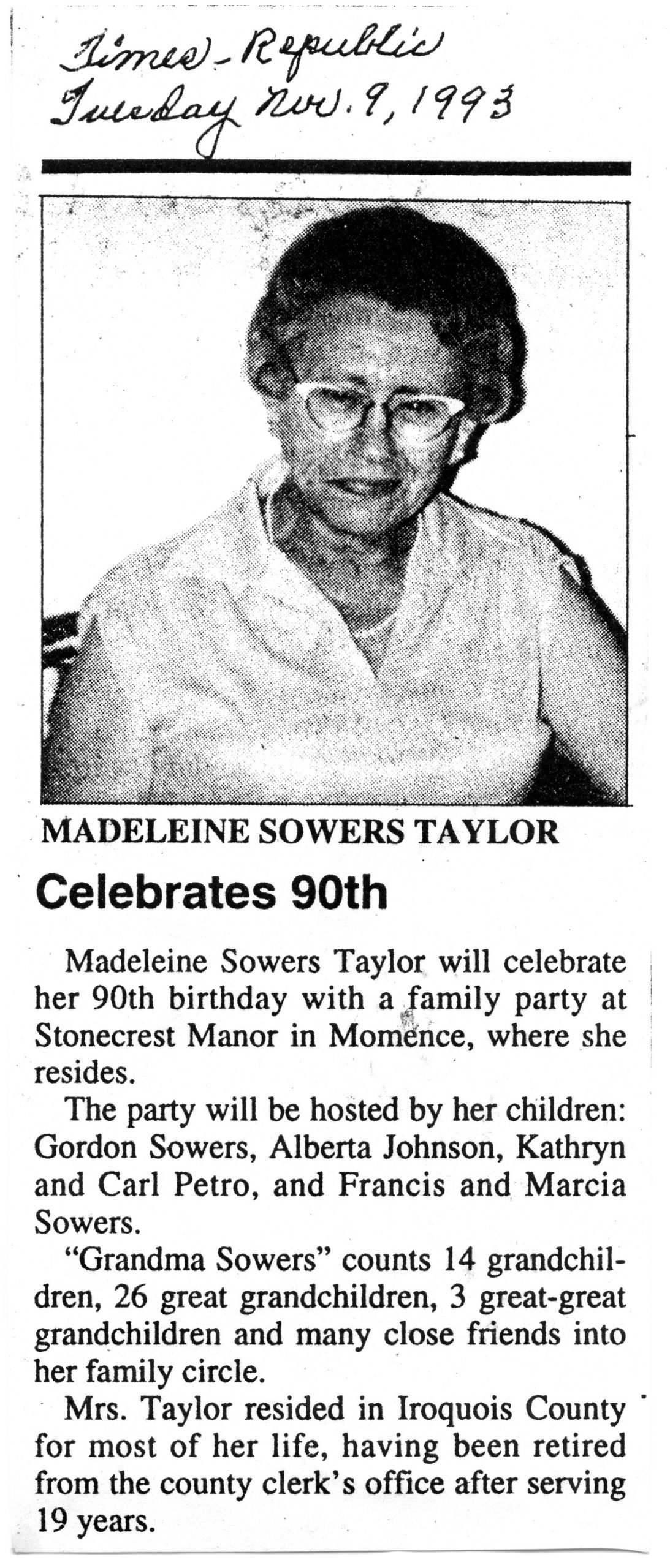 Madeleine Sowers Taylor will celebrate her 90th birthday with a family party at Stonecrest Manor in Momence, where she resides.