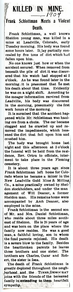 Soon after their marriage Mr. and Mrs. Schlotman came to Sheldon, taking up their residence on the farm south of town, where they have ever since made their home.