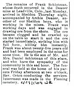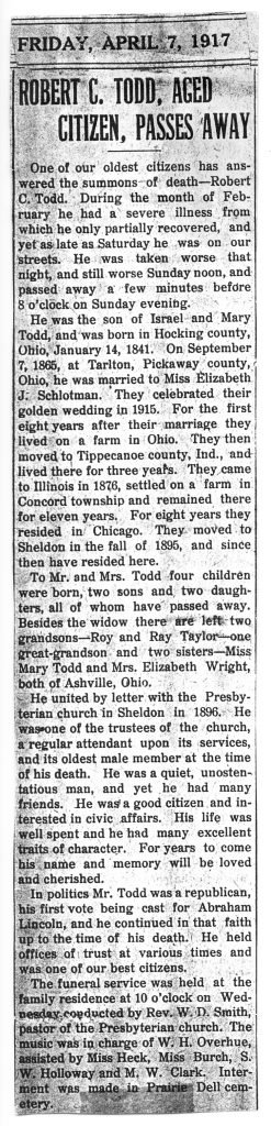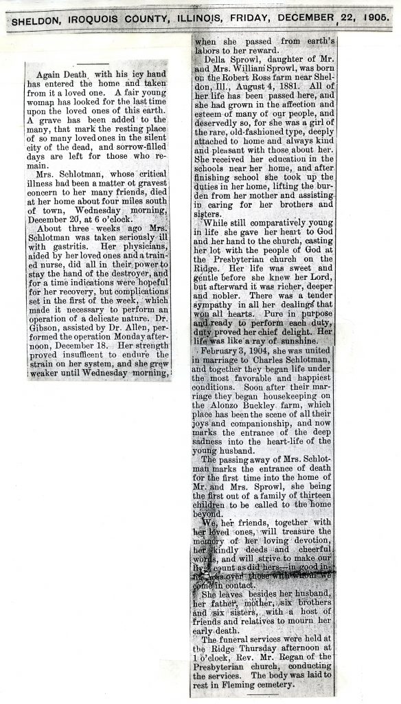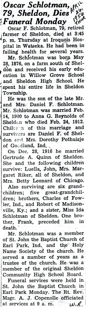 The funeral services of D. F. Schlotman were held at his late home in the country on Friday afternoon at 1:30 o’clock, and were in every respect a fitting tribute to one whose departure was felt as an extreme loss to the community. Rev. J. E. Connor preached a most comforting sermon from the words found in Psalms 90:12.
