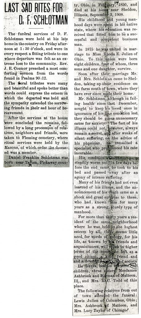 Daniel Franklin Schlotman was born near Tarlton, Pickaway county, Ohio, in February, 1850, and died at his home near Sheldon, Illinois, September 3, 1908.