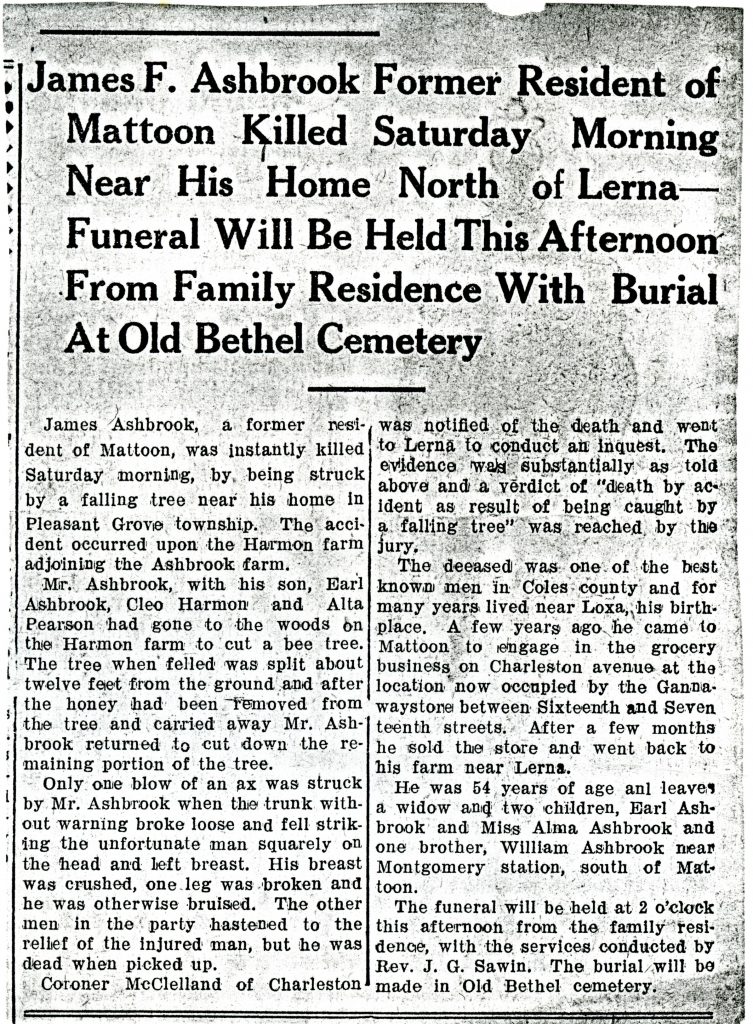 The following relatives from out of town attended the funeral: Lewis Julien of Columbus, Ohio; Mrs. Ashbrook of Mattoon, and Mrs. Lucy Taylor of Chicago.
