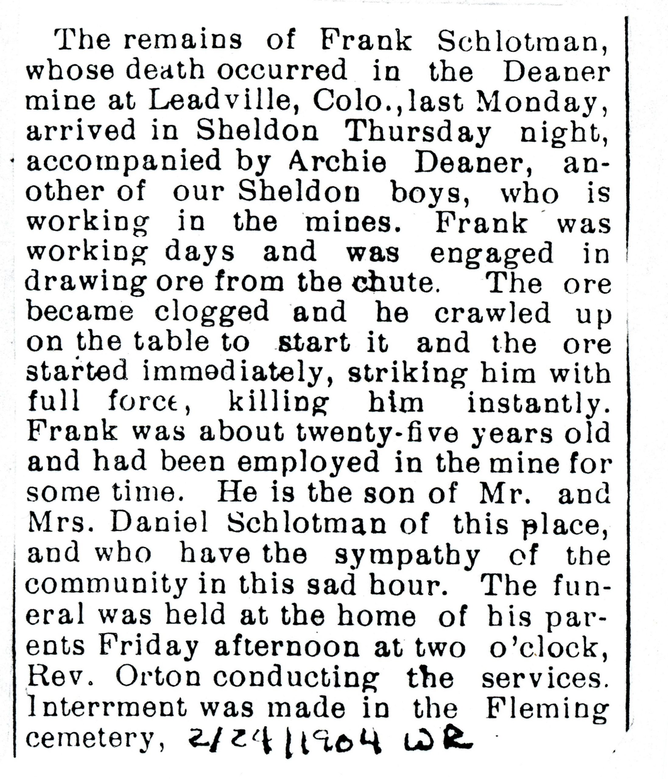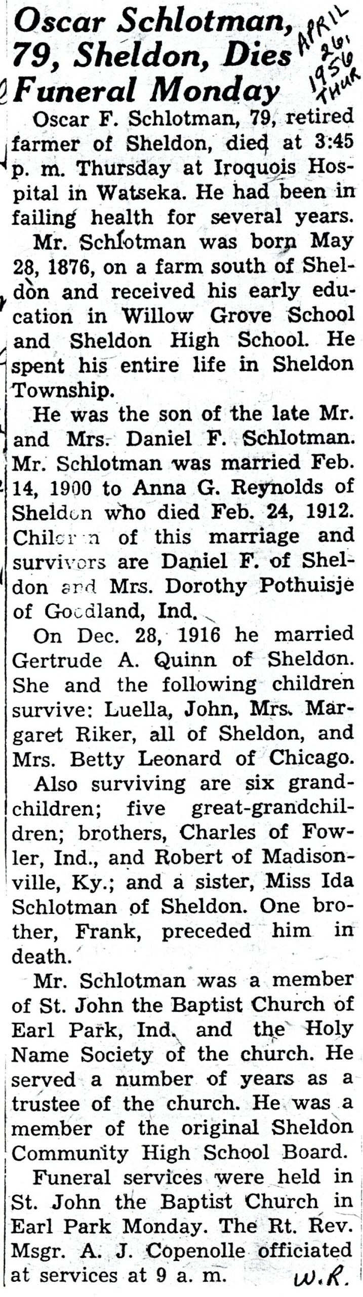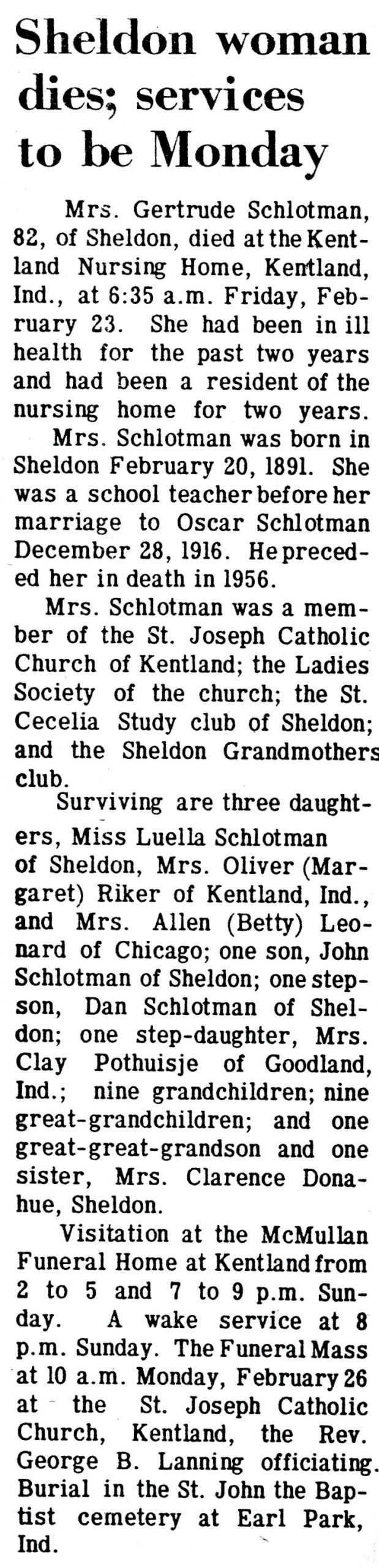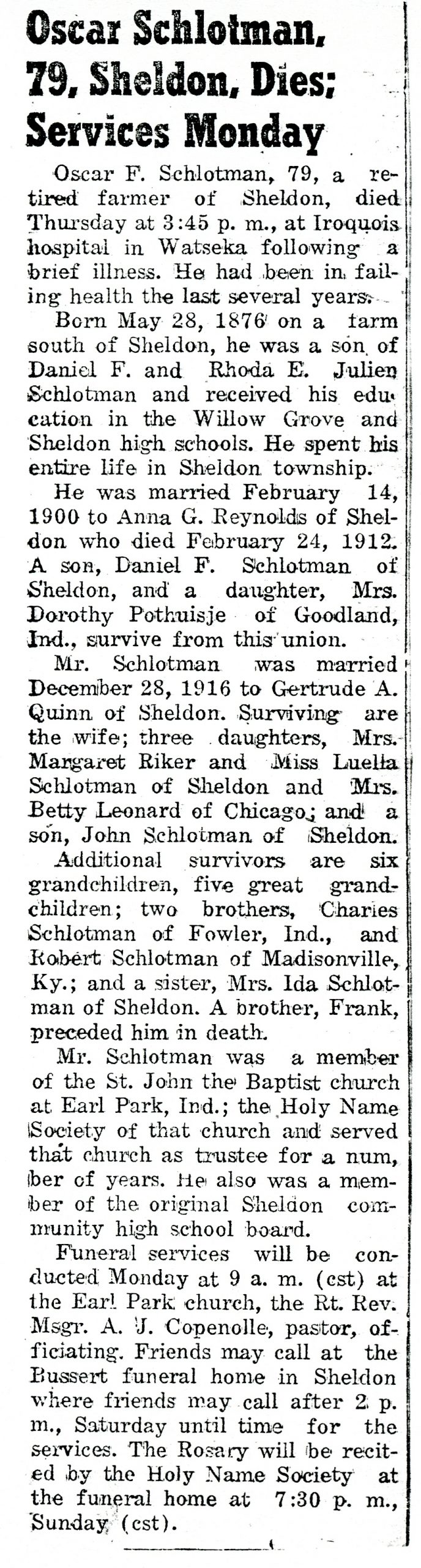 Soon after their marriage Mr. and Mrs. Schlotman came to Sheldon, taking up their residence on the farm south of town, where they have ever since made their home.