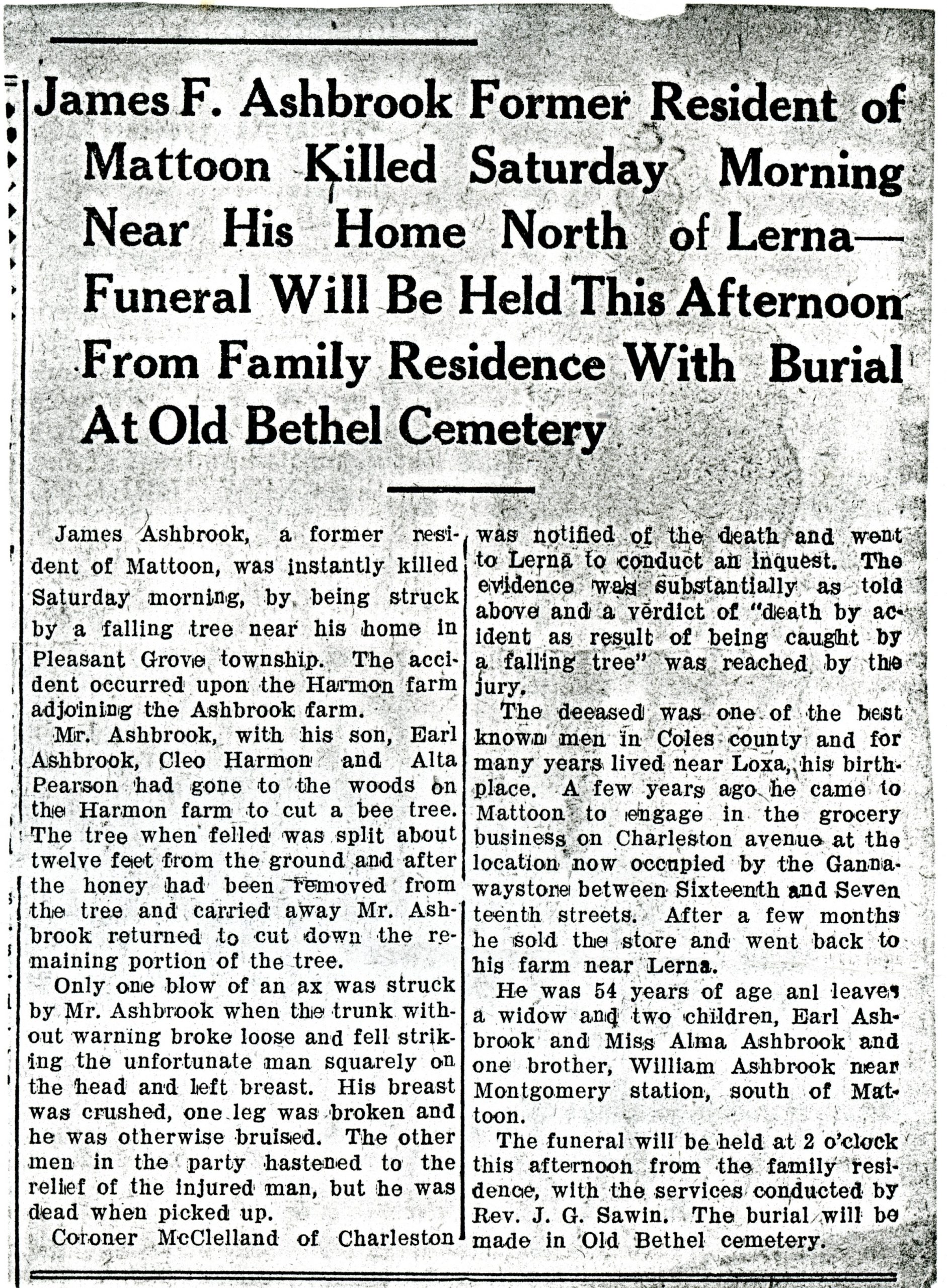 He leaves, besides his wife and children, three sisters, Mesdames Ashbrook and Herman of Mattoon, Ill., and Mrs. R. C. Todd of this place.