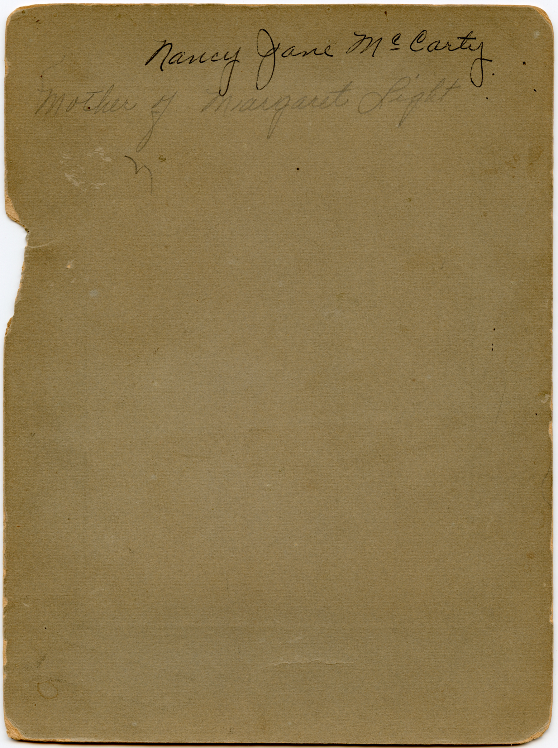 Nancy is wearing a piece of jewelry showing a portrait of her husband, James S. McCarty (1825-1902). I have compared it to the two known photos of James, and it doesn’t appear to be the same.