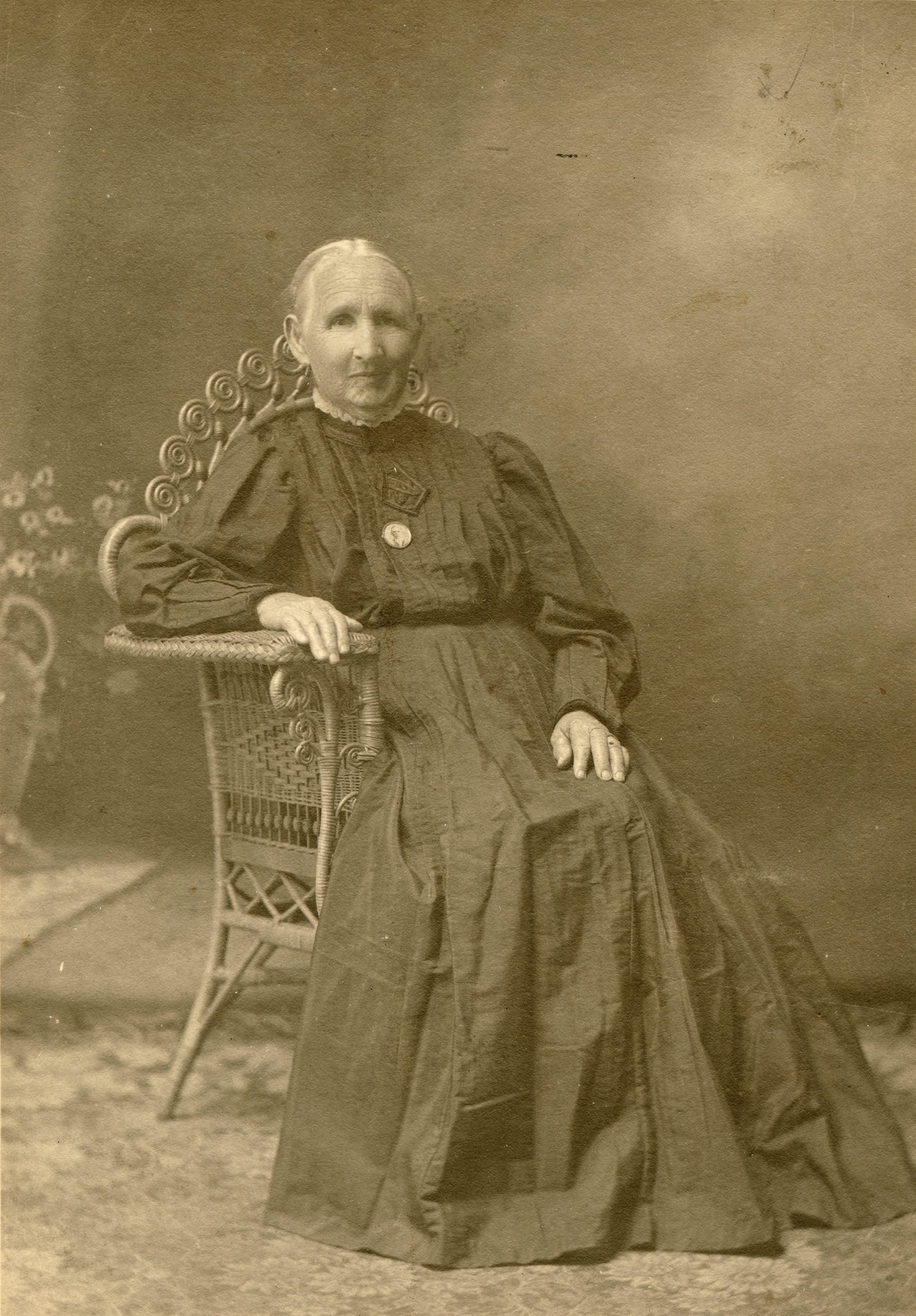 Nancy’s dress is very dark, possibly black, with a bit of white lace or light fabric trimming her collar. It was expected that a widow would wear mourning clothing and adhere to customs for at least a year after the death of her husband. While this might be considered a mourning gown, many elderly widows didn’t adhere to the standard mourning timeframes and just wore black for the remainders of their lives. So, this photo wasn’t necessarily taken within the year following her husband’s death.