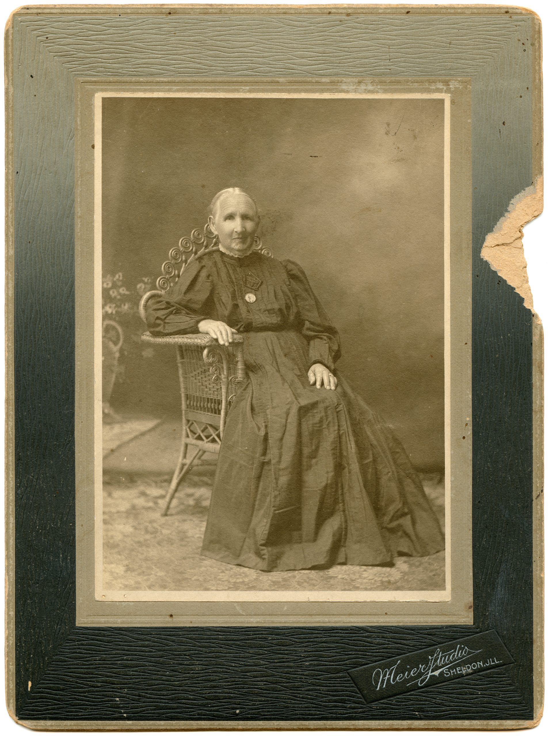 This matte collodion print shows my 3rd great-grandmother, Nancy Jane Hull McCarty (1832-1908) in about 1905. The photo was taken at Meier Studio in Sheldon, Illinois. I have been unable to find any information on this photographer.